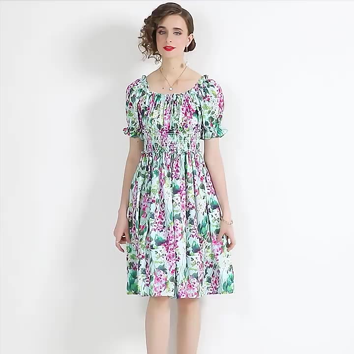 Wholesale Custom Label Women Clothing Summer Fashion Designer Slash Neck Off Shoulder Elastic Waist Chic Floral Print Midi Dress Buy Summer Midi Ladies Dress Holiday Beach Robes Spring Summer Womens Fashion Dress Product